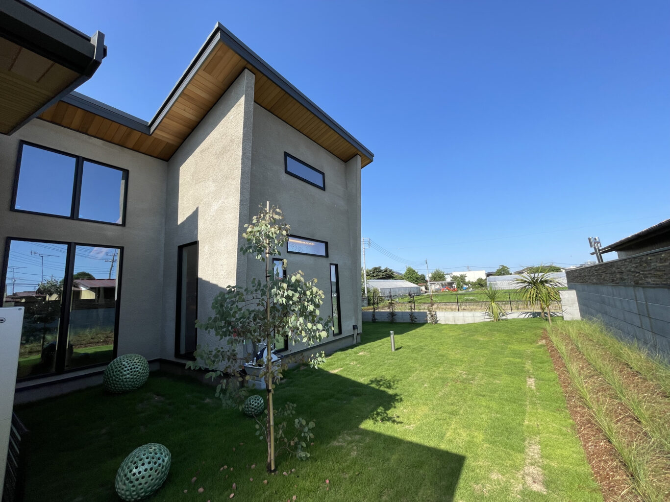 外観は落ち着いたグレーの塗り壁と片流れ屋根が印象的で、室内は木の温もりと柔らかな光に包まれる空間に。