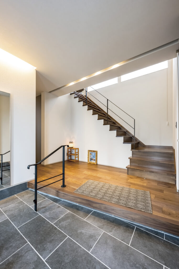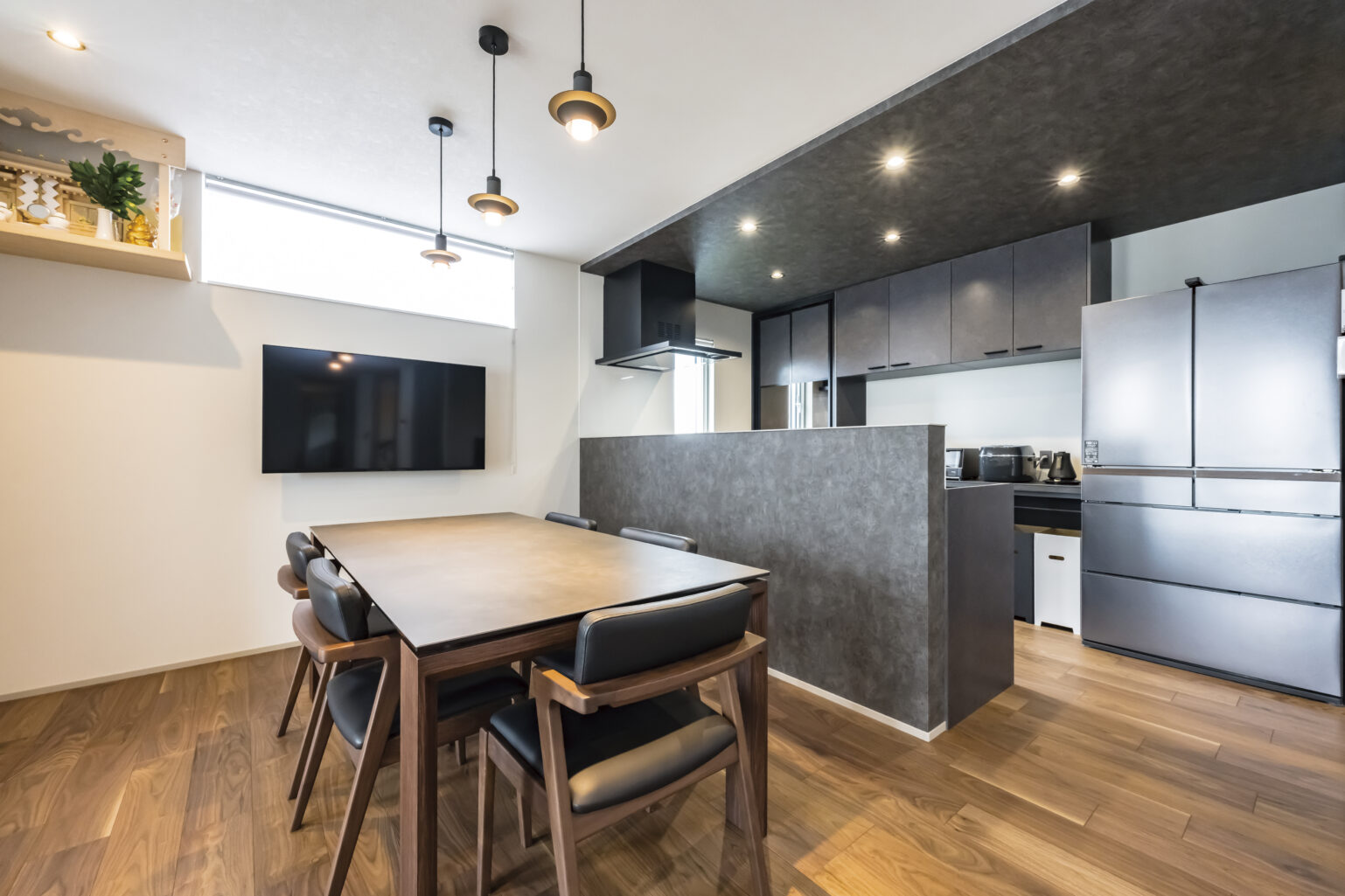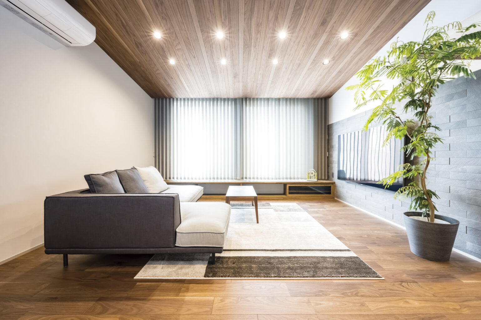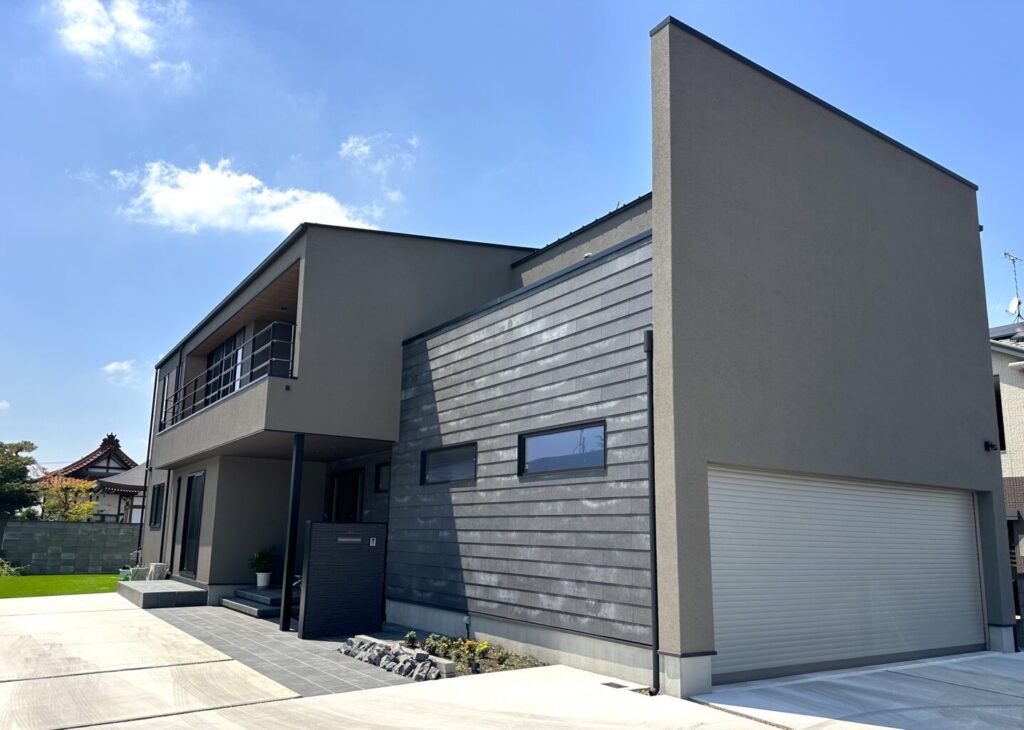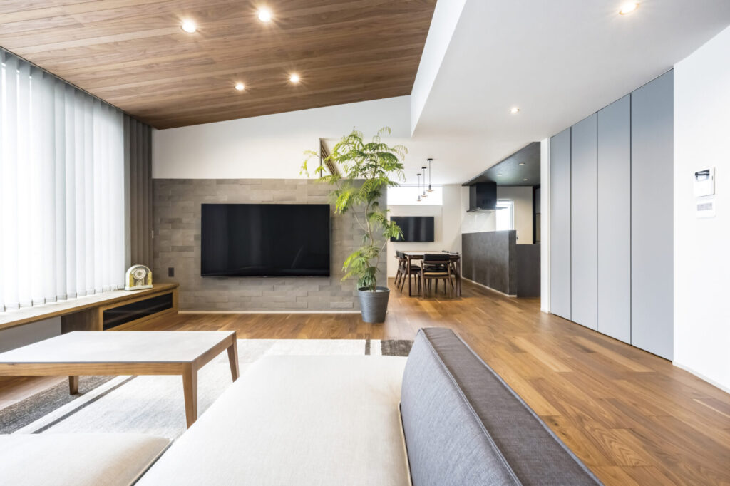 グレーとウォールナットのコントラストが美しく調和する、上質で落ち着きのある住まい。