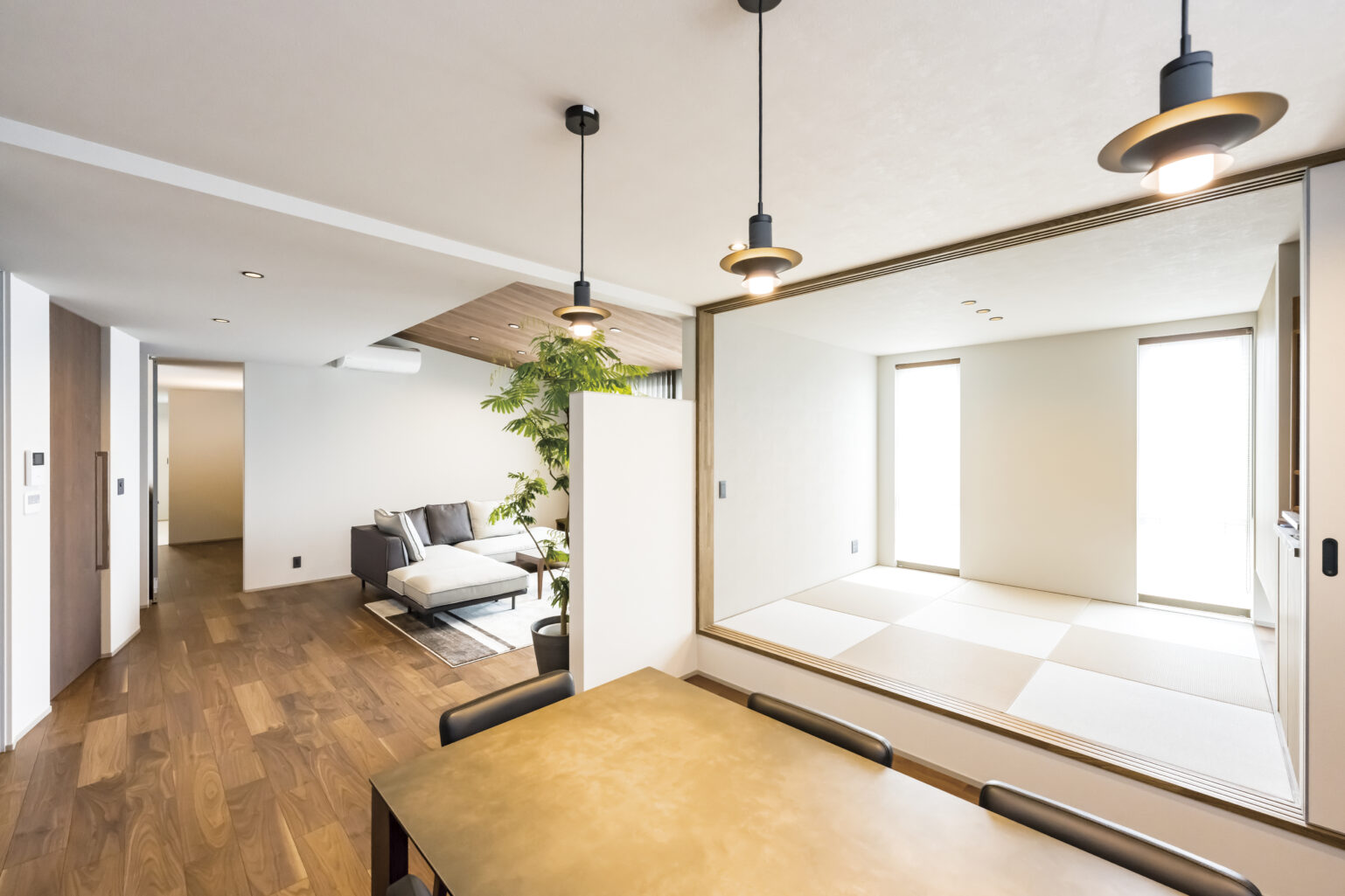 リビングからダイニング、和室までがゆるやかにつながり、自然光が心地よく届く開放的な間取り。